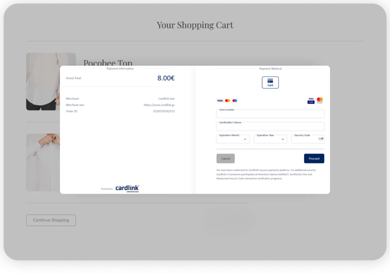 Με το Cardlink checkout δέχεστε πληρωμές στο ηλεκτρονικό σας κατάστημα, αλλά και από οποιοδήποτε άλλο ψηφιακό ή ηλεκτρονικό κανάλι πωλήσεων χρησιμοποιείτε. Ακόμη και εάν δεν έχετε το δικό σας e-shop μπορείτε να πραγματοποιείτε γρήγορες και ασφαλείς συναλλαγές μέσω e-mail ή τηλεφώνου με τη χρήση Payment links από την Cardlink.