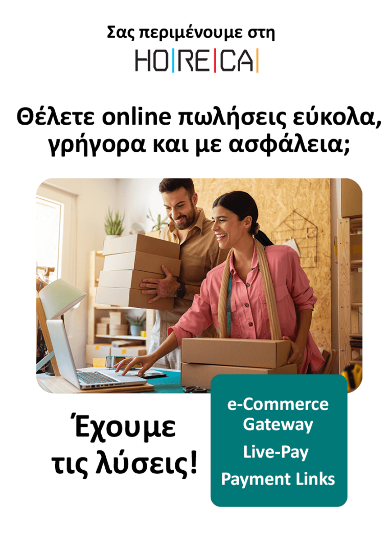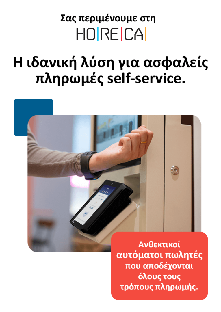 Σας περιμένουμε στην έκθεση HORECA 2025, 07- 10 Φεβρουαρίου 2025 στο Athens Metropolitan Expo, Booth Hall 2 (περίπτερο Α26) για να γνωρίσετε απο κοντά τις πλέον καινοτόμες λύσεις πληρωμών για in-store, on-the-go και self-service συναλλαγές.
